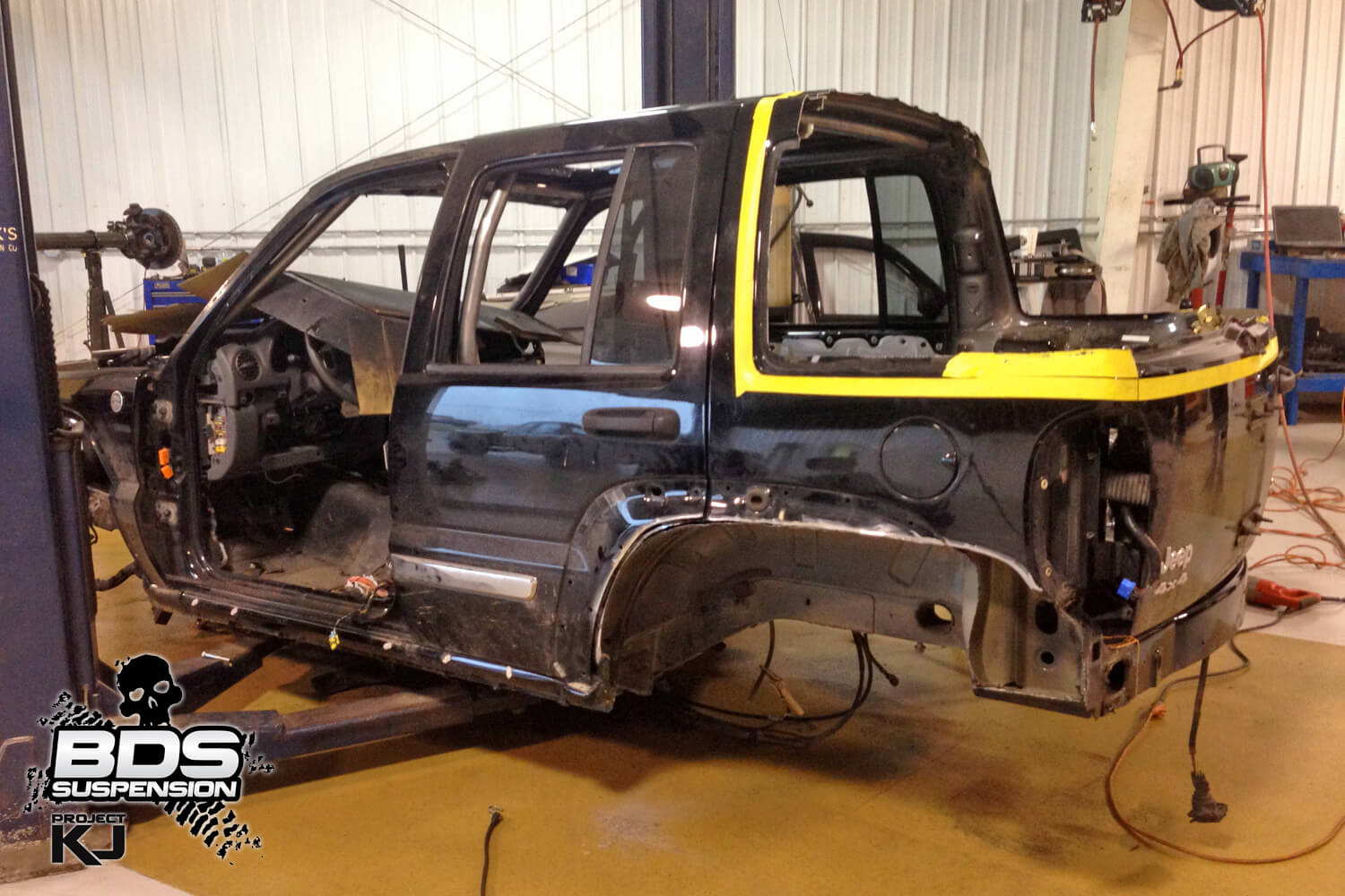 After a few weeks getting sidetracked on new product development projects, the guys down at BDS’s R&D shop found some time to continue working on Project KJ, our ’05 Liberty CRD. The biggest change, the top is gone. We did this for a few reasons; it allows us to store a full size 40″ spare tire and gear, makes the cage much more accessible so we can tie it into the rest of the unibody, and it just looks cool in my opinion. At this point its just a rough cut, we still plan to cut a bit more before closing the cab back off for a weather tight seal (hopefully).
