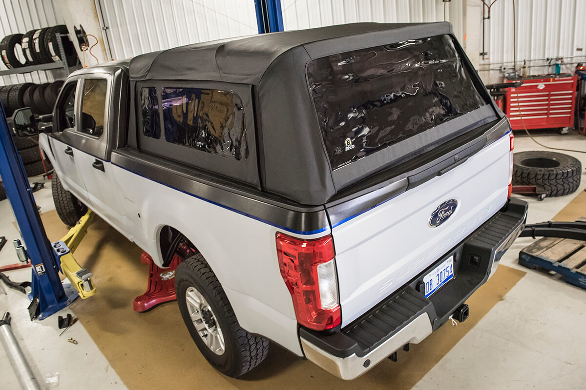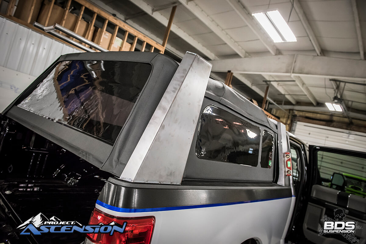 Also under this way are several other mods to the truck. For additional dry storage in the bed a Bestop Supertop was installed in the bed. The sailcloth canvas top clamps to the bed rails and offers easy access to the bed from all sides with rollup tinted windows. Over top of the Supertop the team is fabricating a roof rack for additional storage space and mounting for the lights we’ll be installing. With bigger tires going on this build we added a set of Bushwacker extend-a-fender flares to give us extra tire coverage and a strong, beefy appearance. These come in a molded ABS plastic and wrapped in the brushed aluminum vinyl. Being that this truck will have extra altitude of 6″ of lift and 38s we added a set of the Amp Research Powersteps. We’re huge fans of these steps and run them on just about all of our promotional trucks. They’re easy to install and wire up off the OBD2 port to take cab access much easier and then automatically tuck up out of the way when the doors are closed.