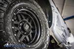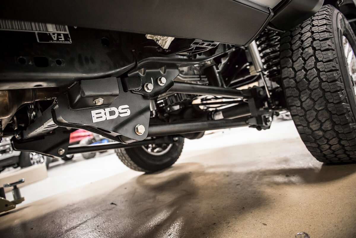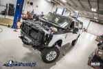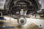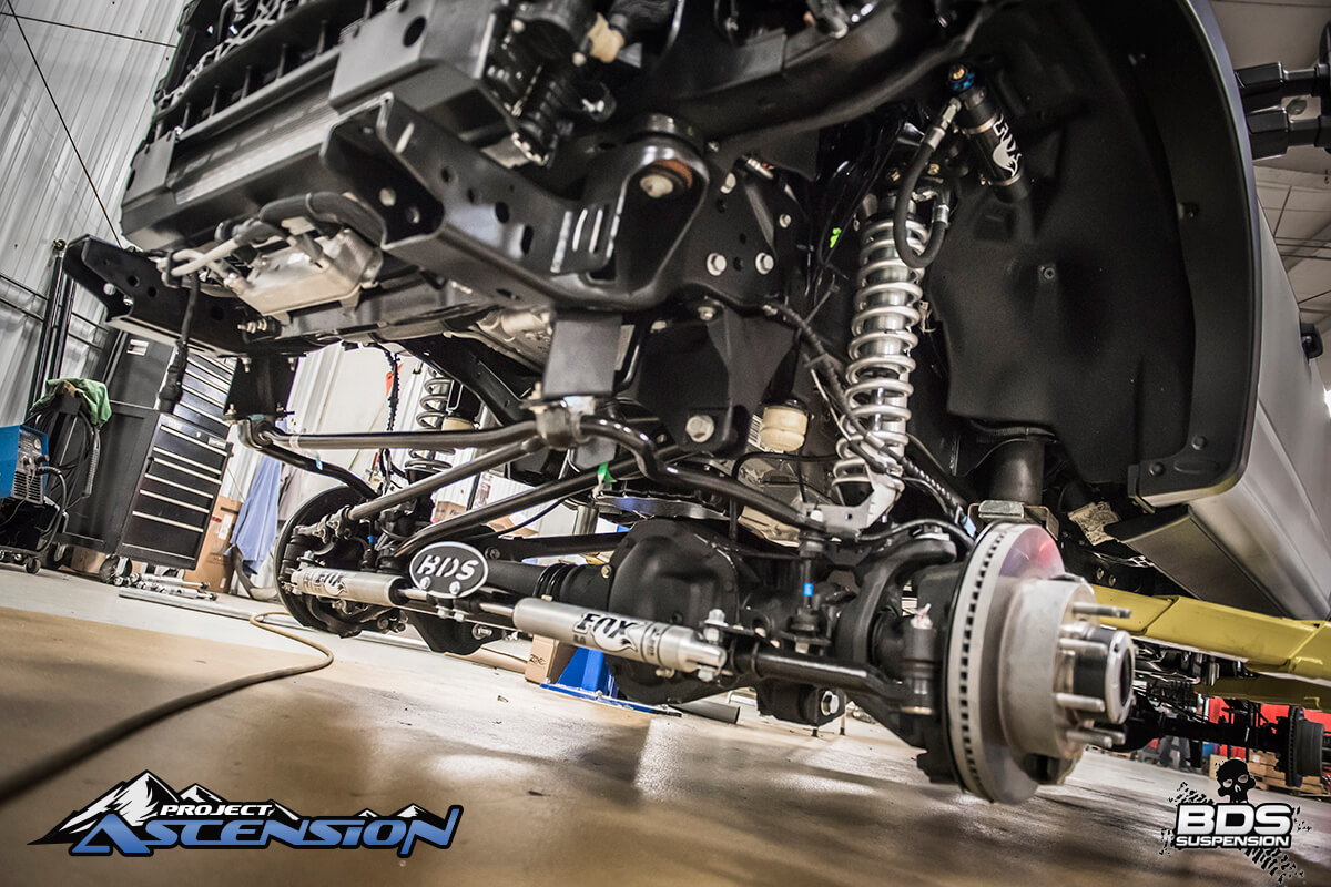 Last time we checked in on the progress the team had the truck back from being wrapped in 3M brushed metallic vinyl and were working on the new suspension design. At this point the suspension is complete, its a pre-production BDS 6″ 4-Link Conversion System w/ FOX 2.5 DSC Coilovers, dual FOX 2.0 steering stabilizer and RECOIL traction bars. The 4-link design will offer improved strength and better caster control, the FOX DSC coilovers offer a smooth ride over any terrain, improved dampening capabilities, and adjustable dampening settings for optimal performance.