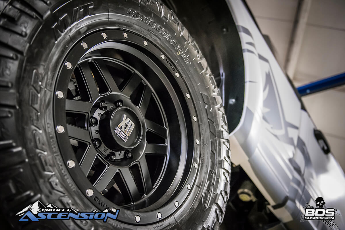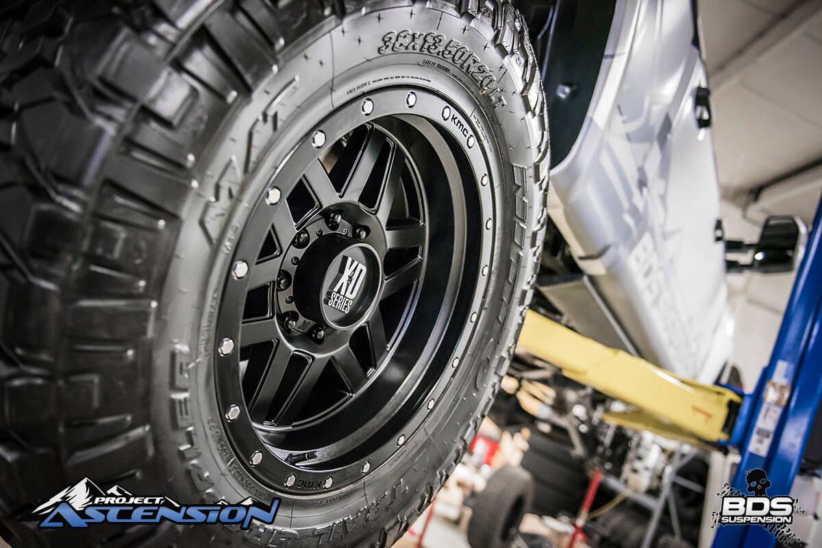 For tires this build is going with 38×13.50×20 Nitto Trail Grapplers. We run these tires on several of our other rigs and have been very impressed with the look, the traction, how easy they are to balance and their 10-ply E road rated sidewall which will come in handy when we’re towing rigs and show trailers across the country. These Nittos are getting mounted up on a set of 20×10 (4.5″ BSing) XD Machete wheels in satin black. These wheels have a clean 6-dual spoke look with a simulated beadlock ring.