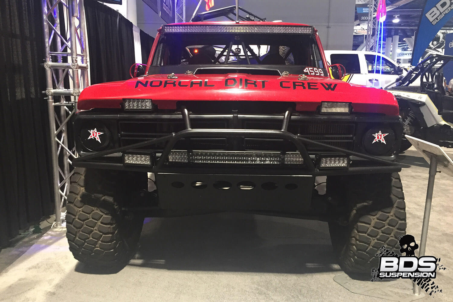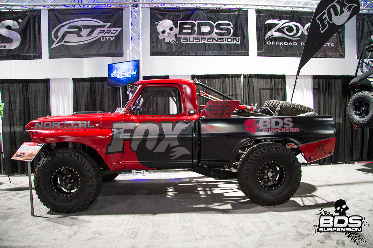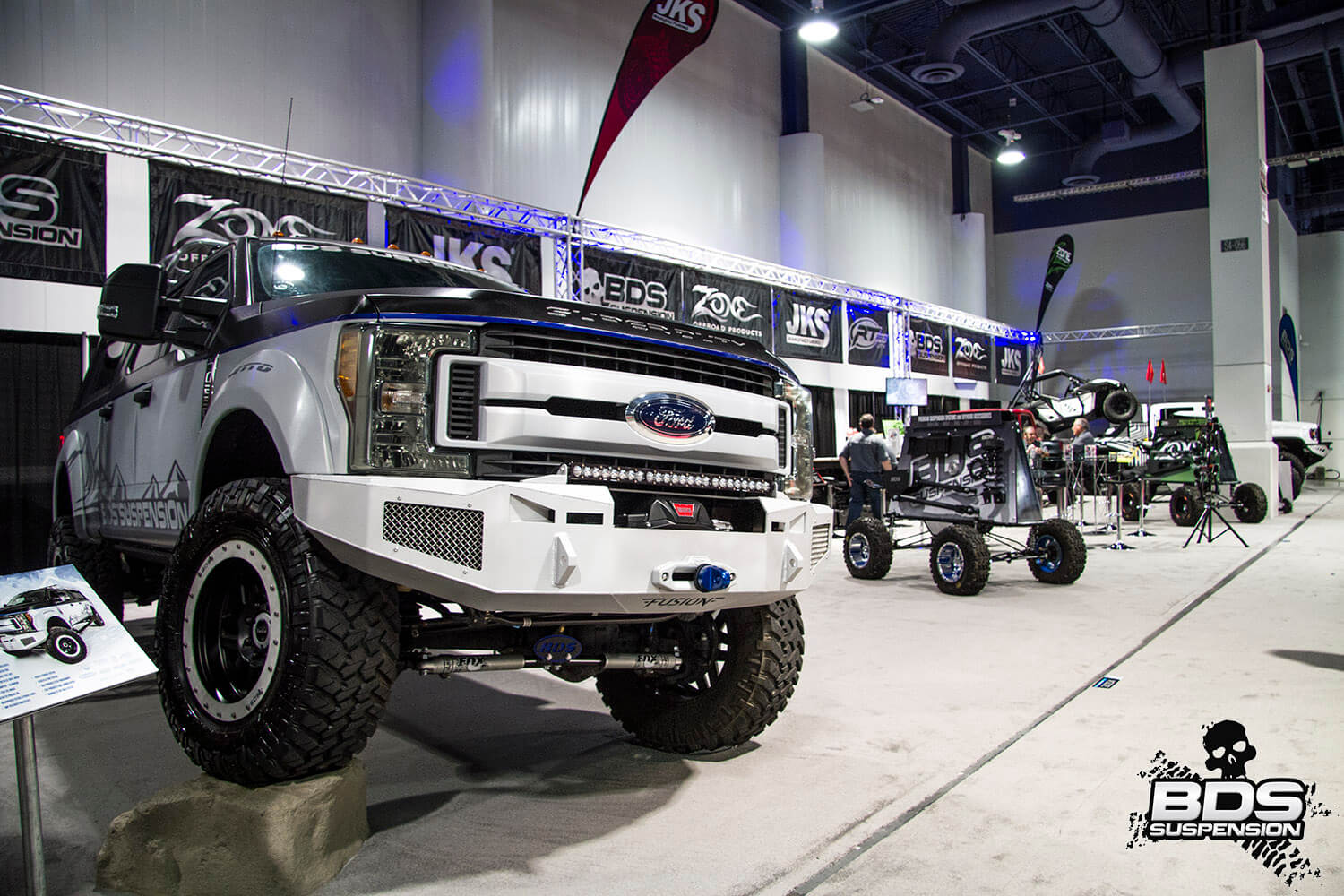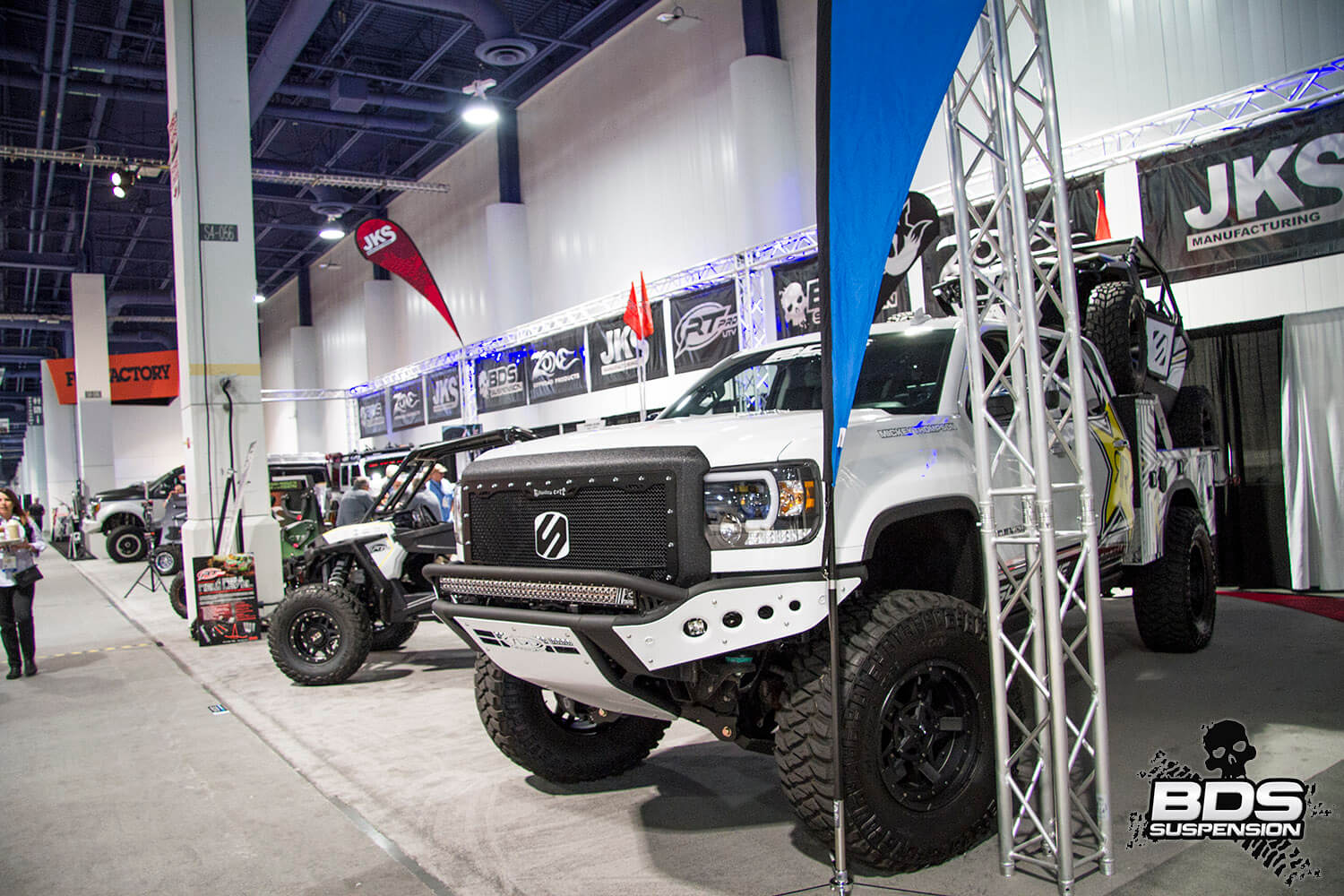 This is BDS Suspension’s 8th year attending the industry show and each the show gets bigger, pushing the envelope, and gets more over the top with manufacturers stepping up to wow the attendees with over-the-top builds, new technology and the latest innovations. BDS had a new booth this year, adjacent to our previous location which was used by parent company FOX. Our new larger 25×90′ booth space (#30204) was shared among our sister companies, BDS Suspension, Zone Offroad Products, JKS Manufacturing, and recently acquired RT Pro UTV. Across our sprawling booth space we had several show vehicles on display including Project Ascension, our 2017 Super Duty that made the cross country journey to SEMA with a stop in Moab to go 4wheeling. Also on display was a Xtreme Offroad Performance built 2016 Jeep JKU sporting the Jspec 3.5″ lift system w/ front coilover conversion, Norcal Motor Company’s ’72 Ford F100 race truck, and the Scosche 2016 GMC Denali HD outfitted with the BDS 6.5″ coilover conversion accompanied by a pair of UTVs outfitted with RT Pro gear.