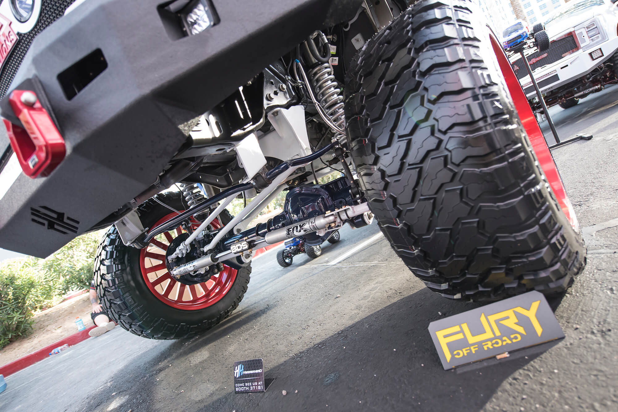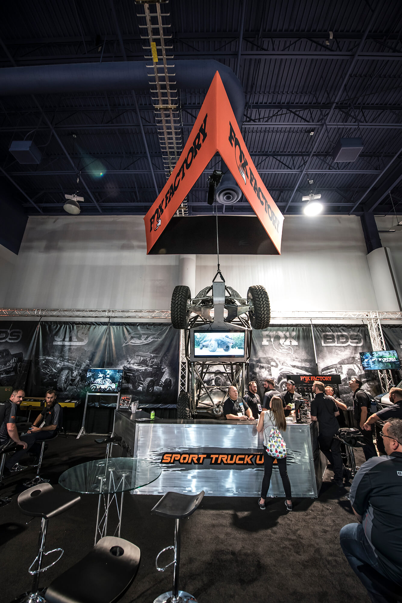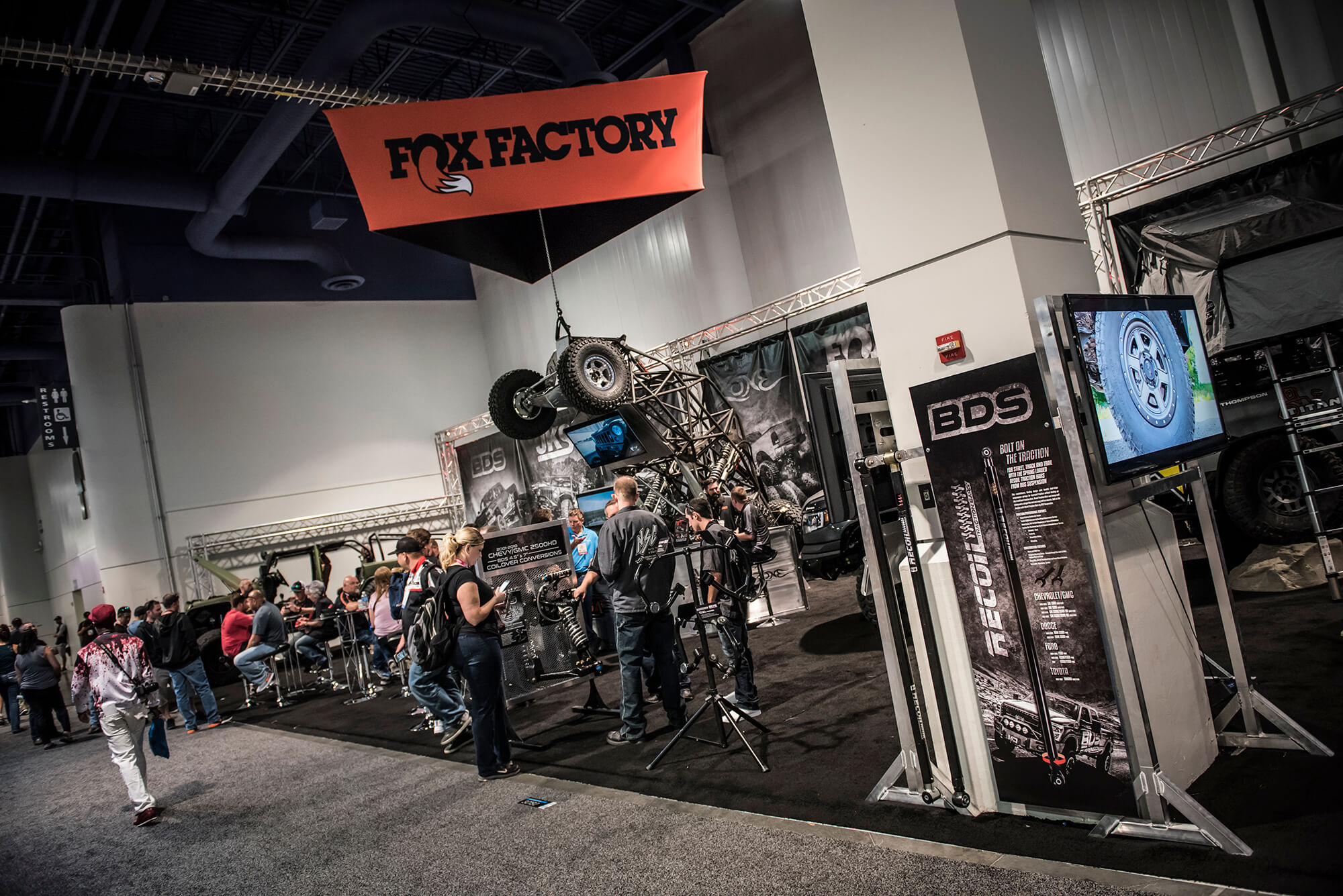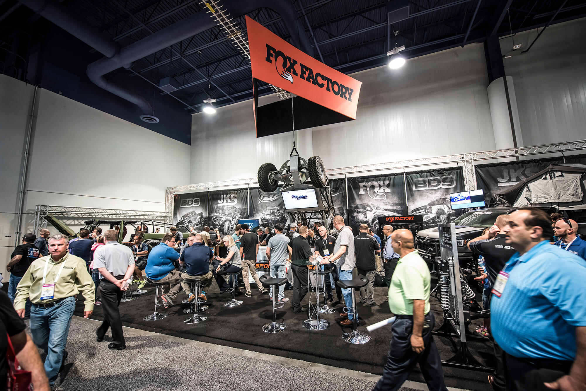 In the booth this year BDS had a large 25×80 footprint in the offroad section to showcase a number of project vehicles, new products, and a newly built bar/lounge area to entertain customers, clients, and media all week long. From right to left we showcased ORO Fab’s 2017 Ford F350 Super Duty Dually outfitted with the BDS 8″ Coilover 4-Link System on 40s, followed by the RT Pro RZR1000 Turbo running the gamut of RT Pro suspension and armor with FOX podium series shocks. Next to that the Rockstar Garage Colorado ZR2 expedition rig outfitted with a prototype BDS 5.5″ DSC Coilover System on 37s. Front and center the new bar/lounge area featured a newly built 16ft wide bar serving up cold beers, waters and Rockstar energy drinks all week long. Acting as backdrop to the bar all week was a 6100 Spec Chassis owned/built by Pacific Fabrication/Tilden Motorsports serving as one of the TV stand to entertain visitors all week long. Last but certainly not least the last vehicle spot was held be another 6wheeled monster, this one being the 6×6 JKU built by Bruiser Conversions running a BDS long arm front with JKS rear arms and FOX coilovers/shocks on 40s. Scattered throughout the booth were several new products and displays highlighting things like the soon to be released late model GM1500 8″ Lift Kits, ’01-10 GM 2500HD 4.5″/7″ Coilover Conversion Kits, RAM Rebel Lift Kits, RAM Powerwagon Lift Kits, new Ford Super Duty Lift Kits, new UCA Kits for popular applications and updated 2018 model listings. Keep an eye out for these new products to hit the shelves ready to ship over the coming weeks/months.