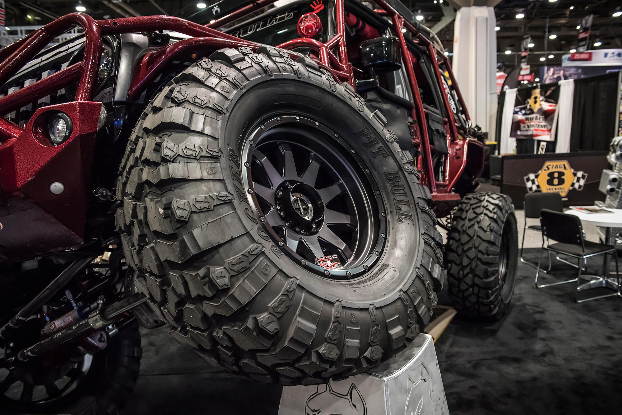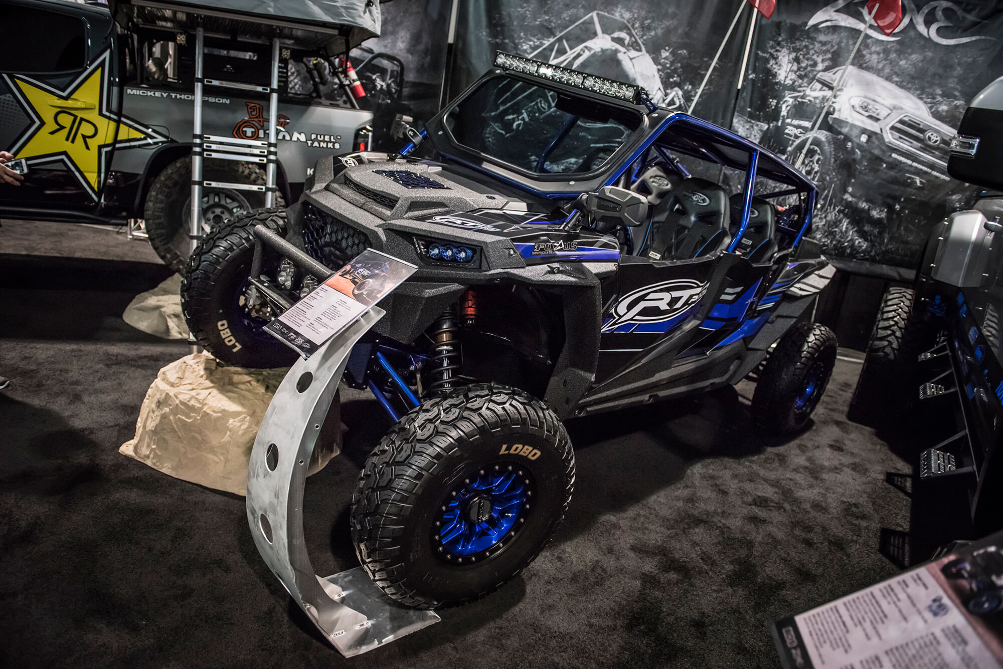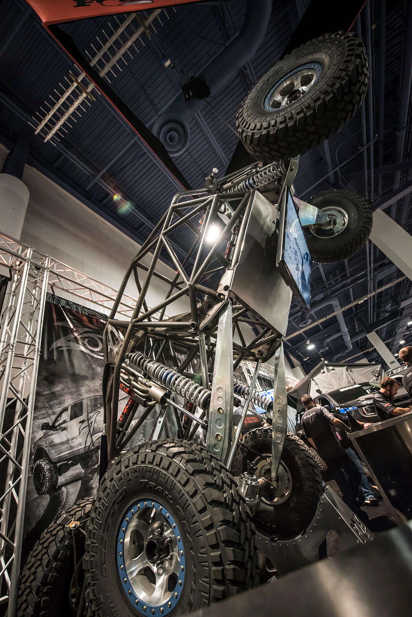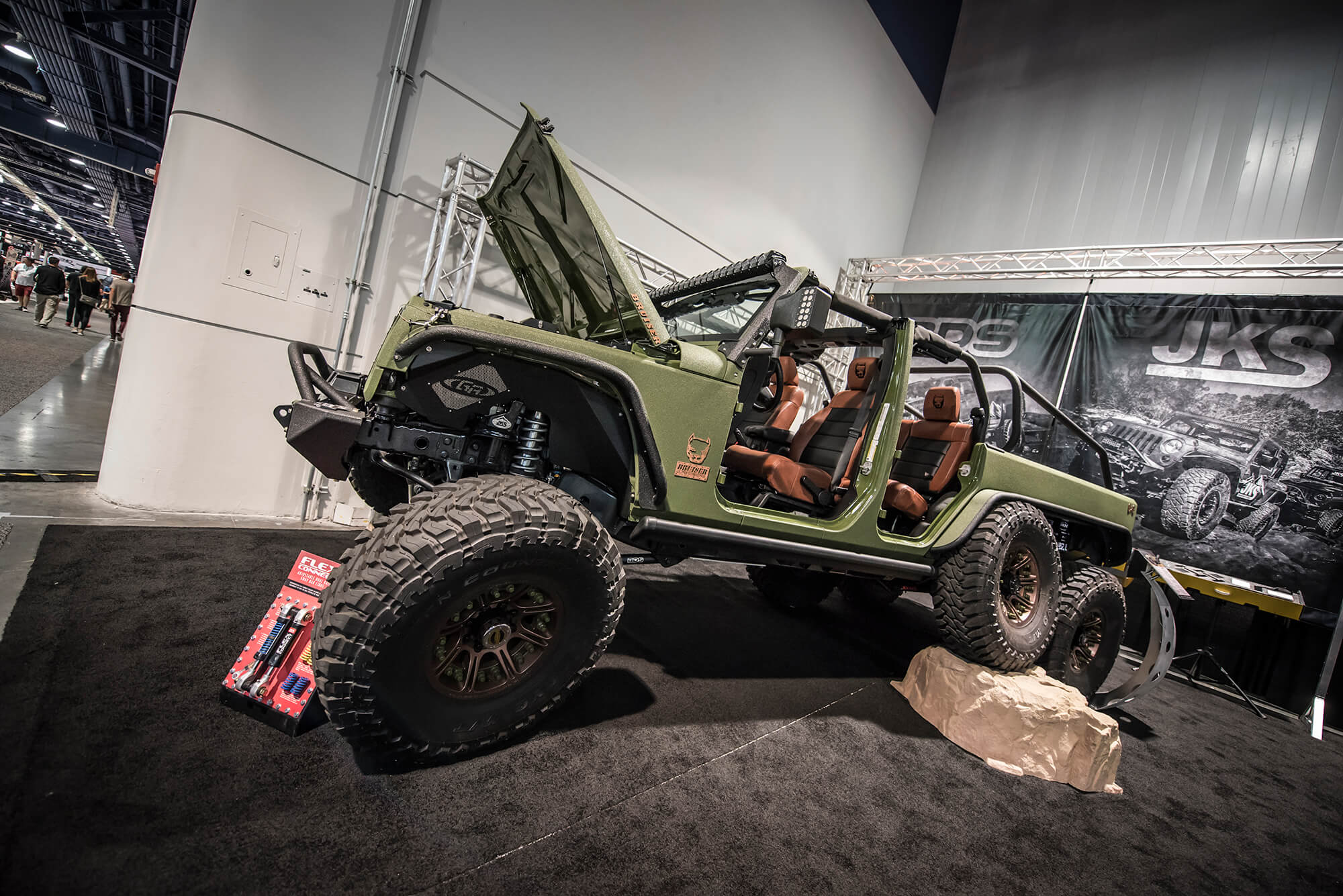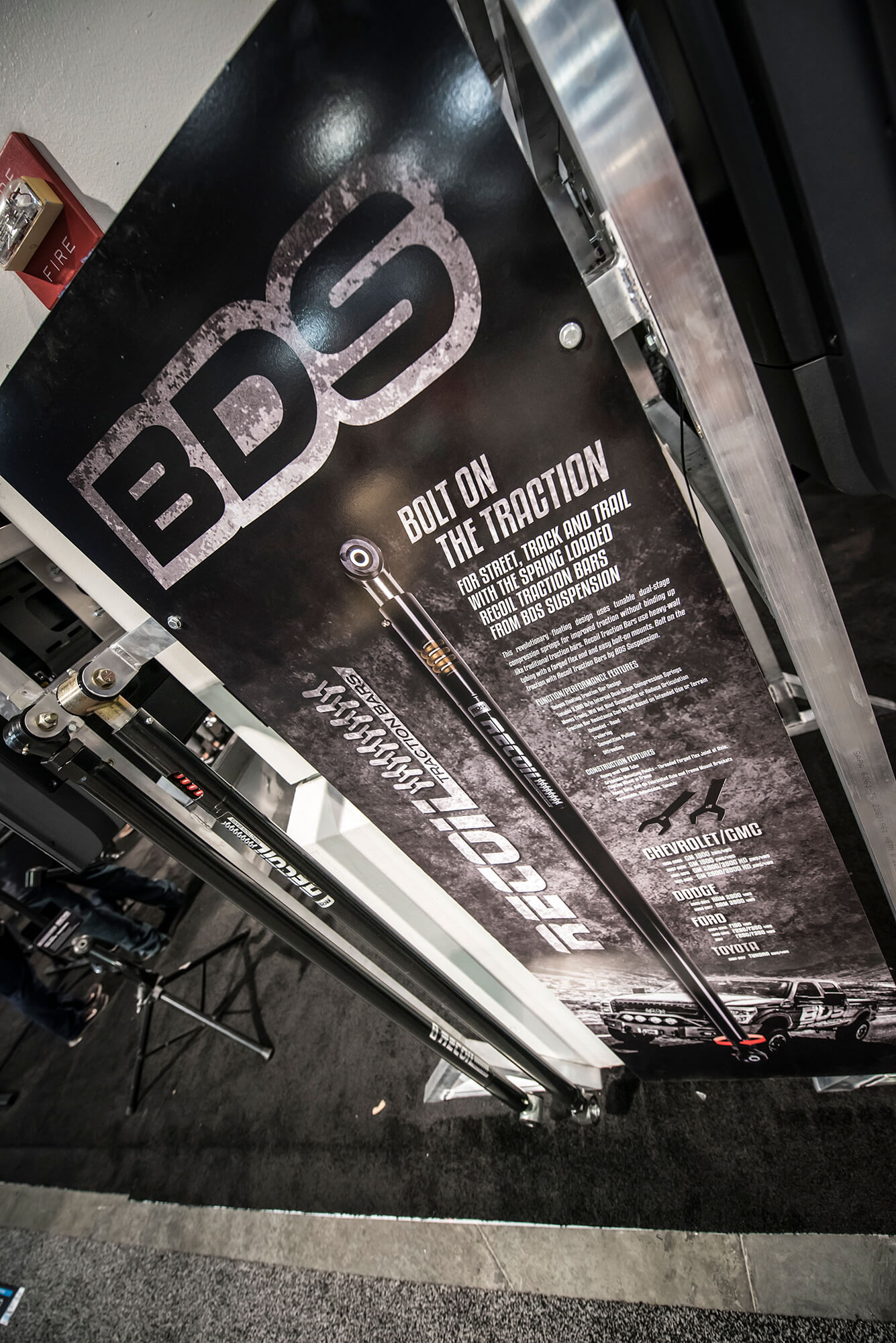 In the booth this year BDS had a large 25×80 footprint in the offroad section to showcase a number of project vehicles, new products, and a newly built bar/lounge area to entertain customers, clients, and media all week long. From right to left we showcased ORO Fab’s 2017 Ford F350 Super Duty Dually outfitted with the BDS 8″ Coilover 4-Link System on 40s, followed by the RT Pro RZR1000 Turbo running the gamut of RT Pro suspension and armor with FOX podium series shocks. Next to that the Rockstar Garage Colorado ZR2 expedition rig outfitted with a prototype BDS 5.5″ DSC Coilover System on 37s. Front and center the new bar/lounge area featured a newly built 16ft wide bar serving up cold beers, waters and Rockstar energy drinks all week long. Acting as backdrop to the bar all week was a 6100 Spec Chassis owned/built by Pacific Fabrication/Tilden Motorsports serving as one of the TV stand to entertain visitors all week long. Last but certainly not least the last vehicle spot was held be another 6wheeled monster, this one being the 6×6 JKU built by Bruiser Conversions running a BDS long arm front with JKS rear arms and FOX coilovers/shocks on 40s. Scattered throughout the booth were several new products and displays highlighting things like the soon to be released late model GM1500 8″ Lift Kits, ’01-10 GM 2500HD 4.5″/7″ Coilover Conversion Kits, RAM Rebel Lift Kits, RAM Powerwagon Lift Kits, new Ford Super Duty Lift Kits, new UCA Kits for popular applications and updated 2018 model listings. Keep an eye out for these new products to hit the shelves ready to ship over the coming weeks/months.
