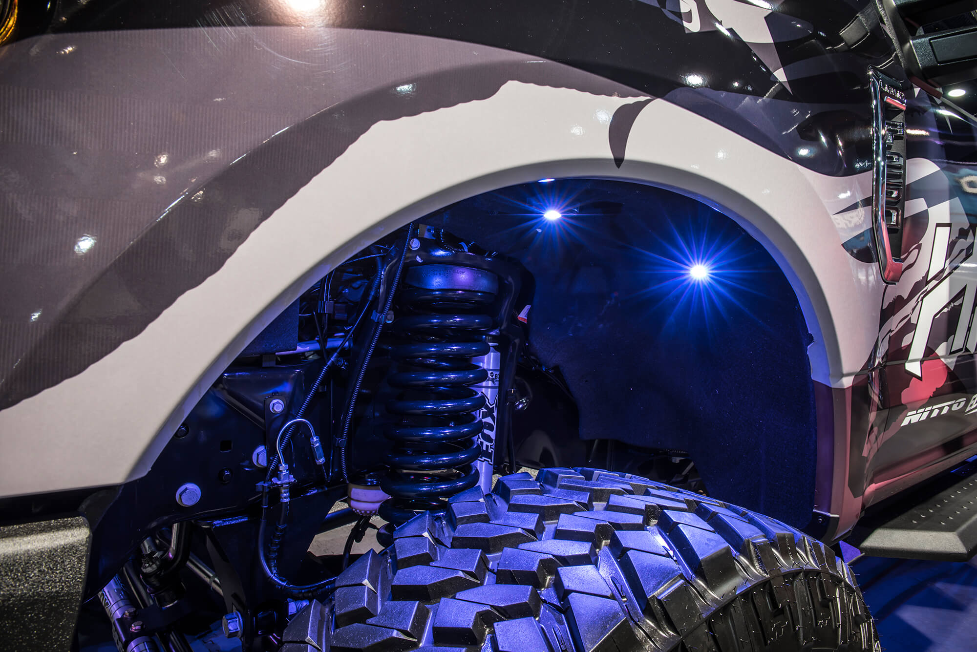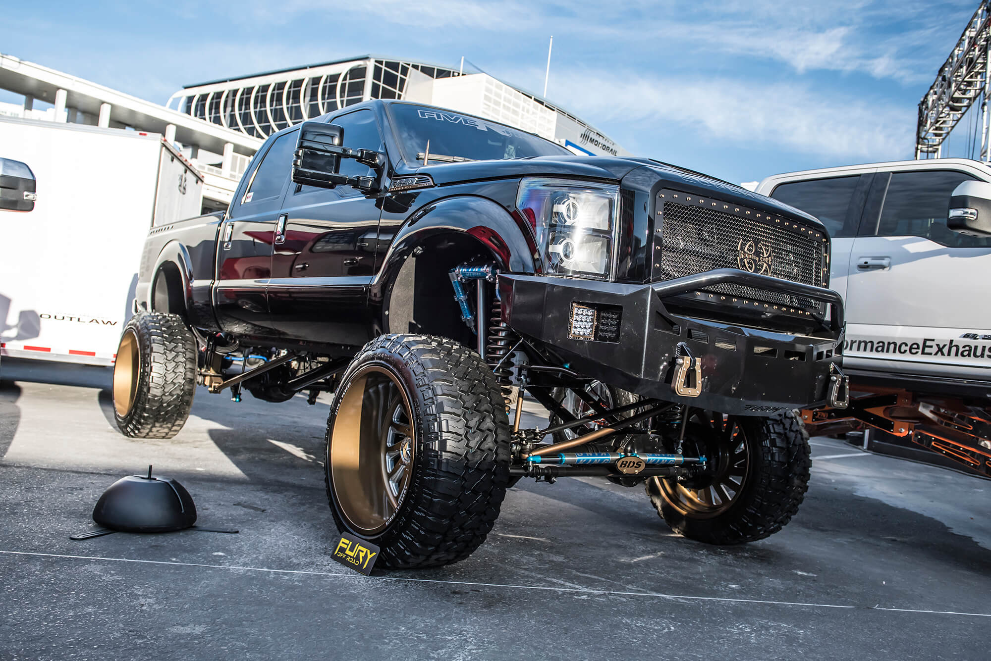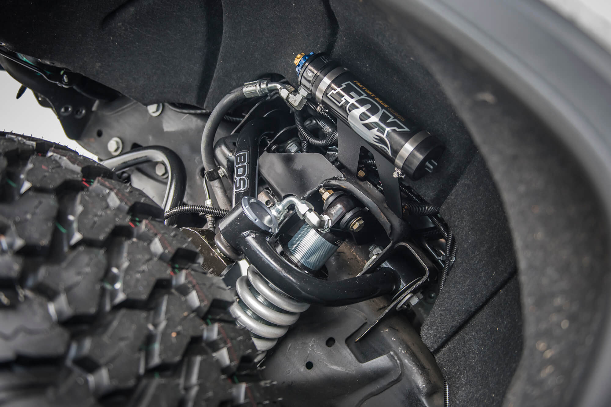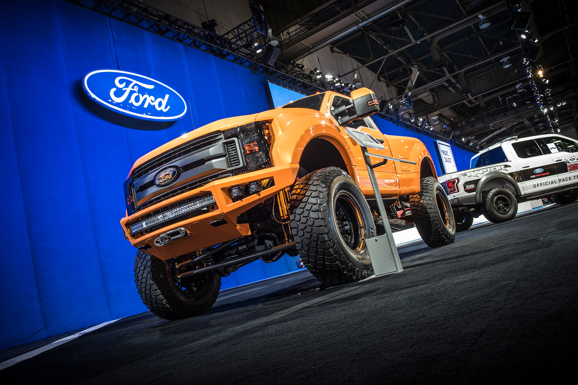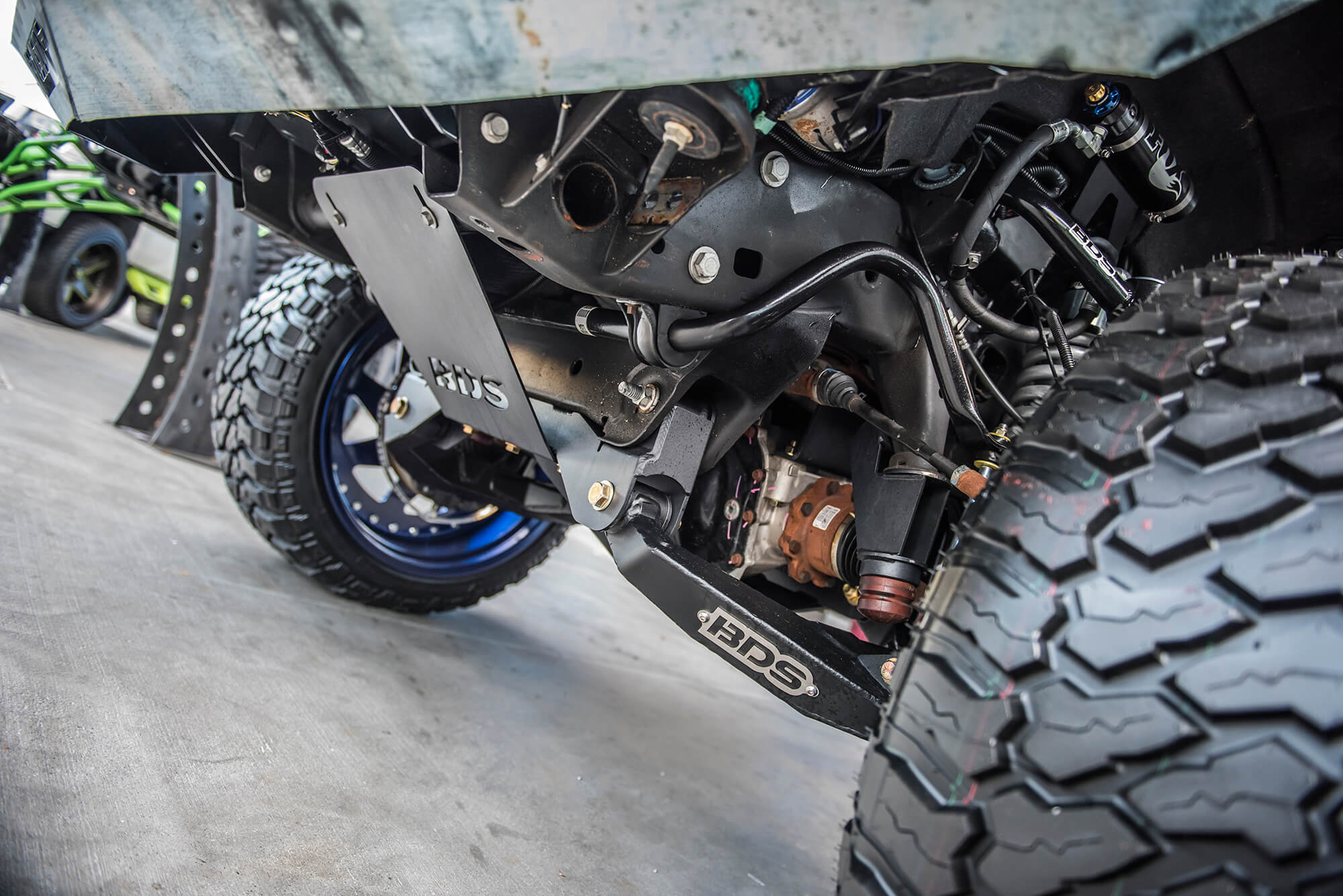 While its become customary for the BDS team to build a promotional/trail vehicle to debut at the SEMA Show, this year we had the honor to build a truck for Ford’s main booth. Located over in central hall and out front of LVCC, Ford hands down has the best presence at SEMA of any of the OE manufacturers showcasing cool rigs, live demos and drift ride alongs for show goers. Our contribution for Ford’s booth this year was a super cool standard cab, short bed converted 2017 Ford Super Duty dubbed Project SD126. The short (126″) wheelbase truck had aggressive Raptoresque styling with a BDS 4-link/trailing arm setup with FOX coilovers and bypass shocks on 42″ tires. We’re excited to hit the trail with this vehicle to see what its capable of so keep an eye out for more coverage on SD126. For the complete rundown on the build up of Project SD126 click here.