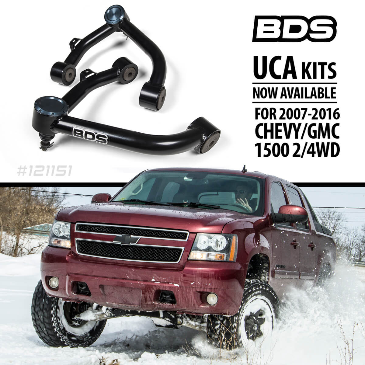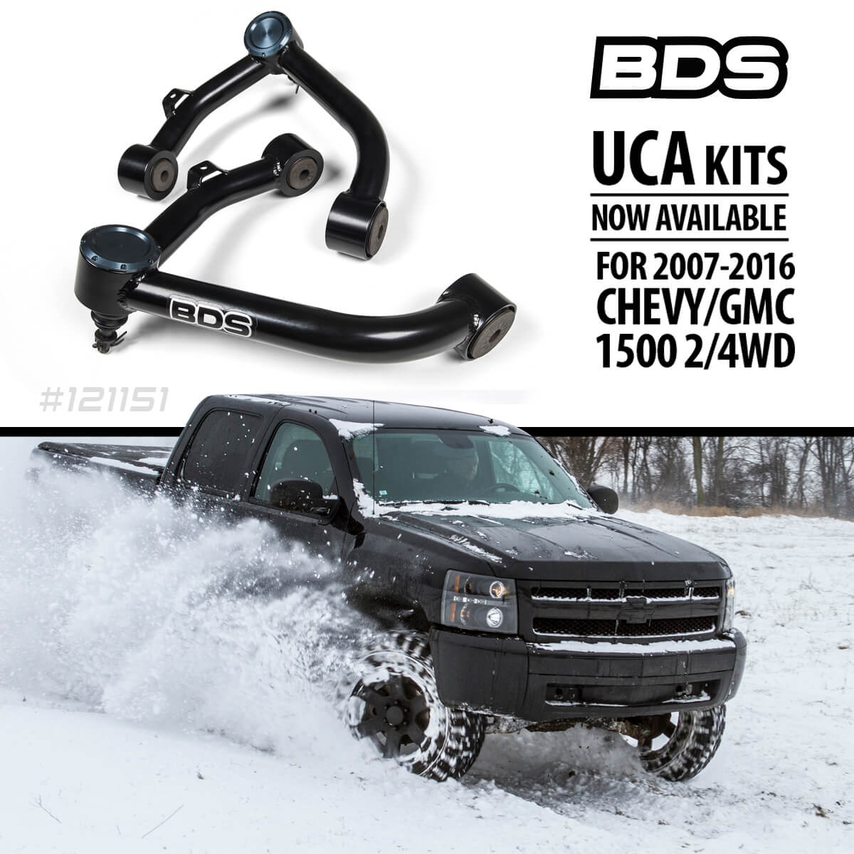 Hey Brad, On the ’14-18 GM1500 trucks one of 3 different factory arm were used (cast steel, stamped steel, and aluminum). Our UCA kits are compatible with the BDS 8″ high clearance systems, but the arm needed is dependent on the factory arms installed on your truck. If your truck is equipped with cast steel arms use #121151 UCA Kit. We haven’t released our UCA kits for trucks equipped with factory stamped steel or aluminum arms, but will have them available very soon.