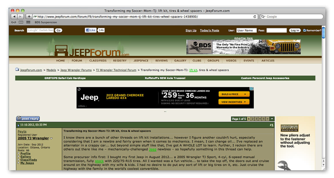 JeepForum.com is one we frequent. We came across a thread recently by a guy named “Peyts” from Ontario, who was starting out the build on his family TJ with plans to turn it into a weekend warrior. Check out the build thread and join the discussion at http://www.jeepforum.com/forum/f9/transforming-my-soccer-mom-tj-lift-kit-tires-wheel-spacers-1438900/