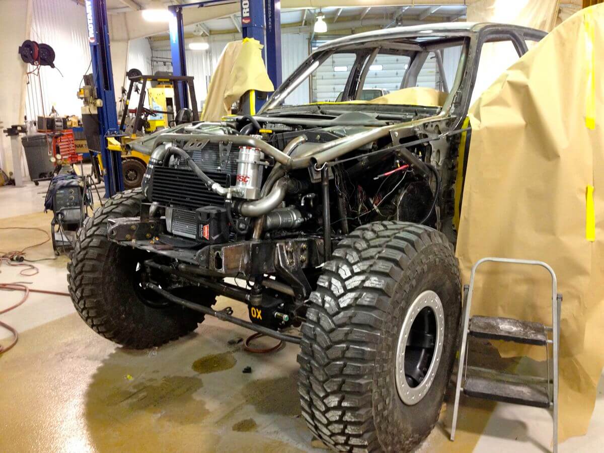 We’re in the home stretch for Project KJ with plenty more that needs to go on for final fitment. After a frustrating 48 hours resolving a no start issue that held up progress the team is scrambling to get this KJ Ultimate Adventure ready. Since our last update, axles have been assembled the rest of the way, bumpers have been fabbed up, the no-start issues have been resolved, body has ben prepped for paint and skid plates have been started. After another long day yesterday the Jeep went into the makeshift paint booth to be shot a color called Anvil. It’s a slate gray color that Jeep used for 2013 on the 10th Anniversary Rubicons along with red/black accents. With paint drying on the top side, the Jeep has been wheeled out into the shop to start being reassembled. It’s a mad rush to the finish (or start) of Ultimate Adventure 2013 and it’s all hands on deck. We’ll be posting photos periodically on our Facebook Page so stay tuned to watch it come together.