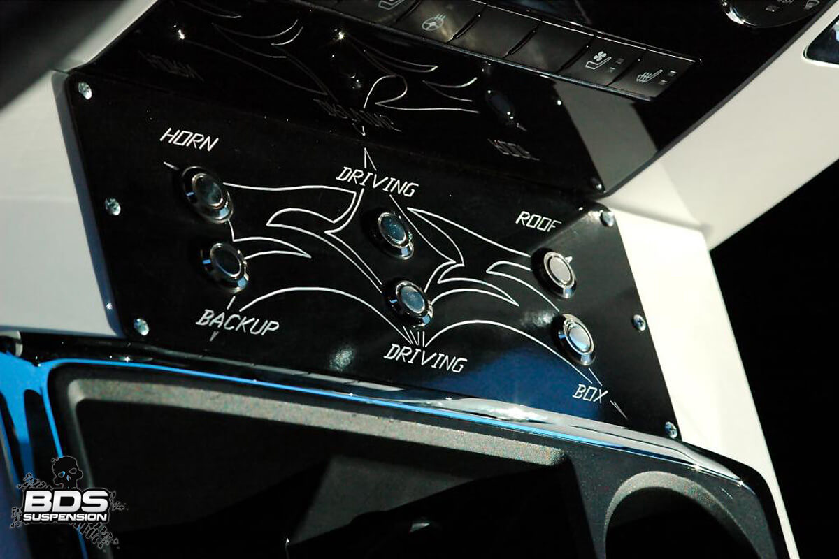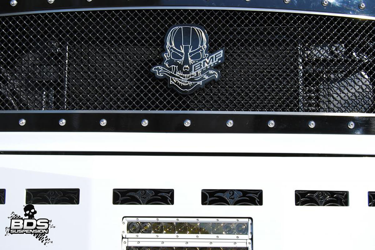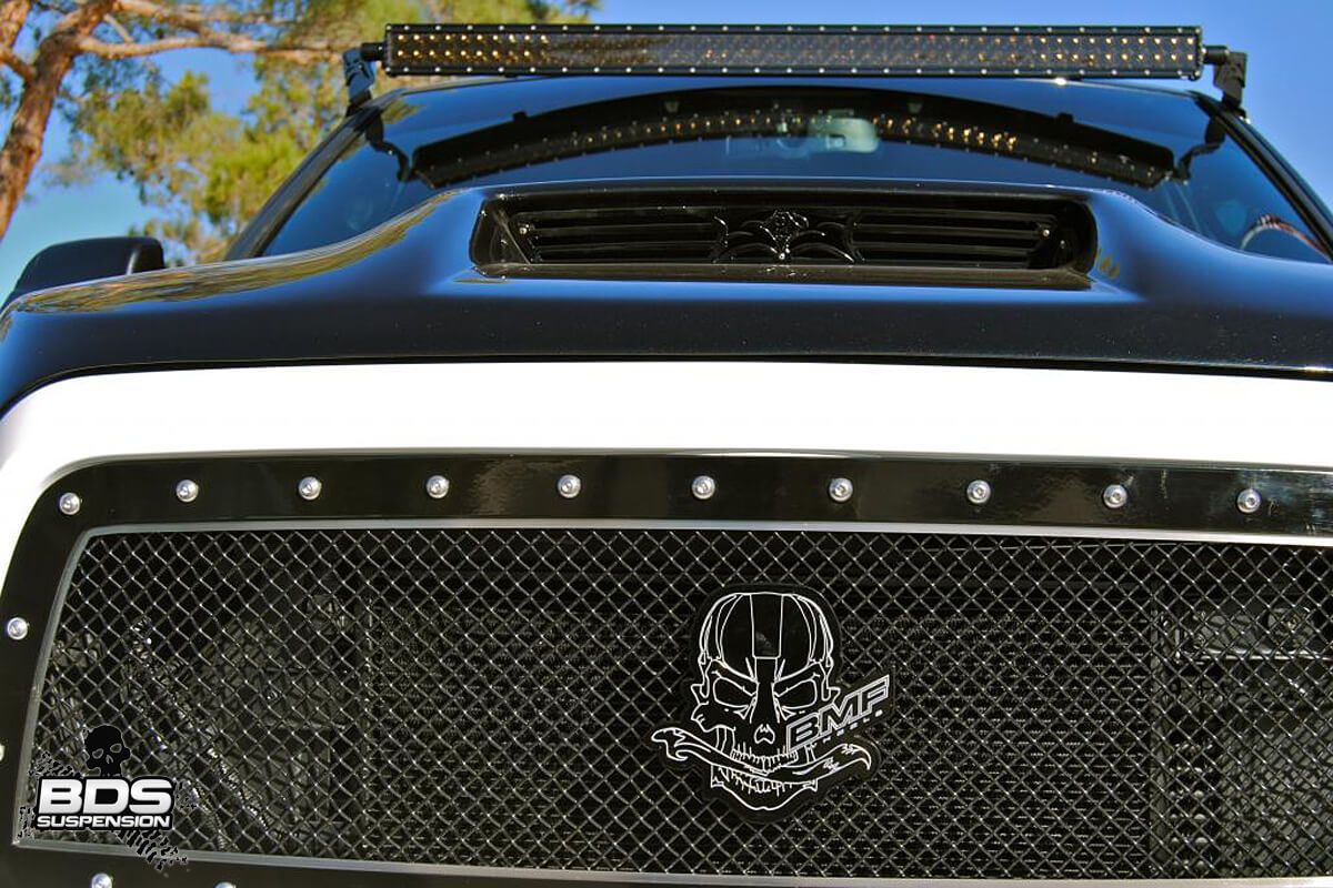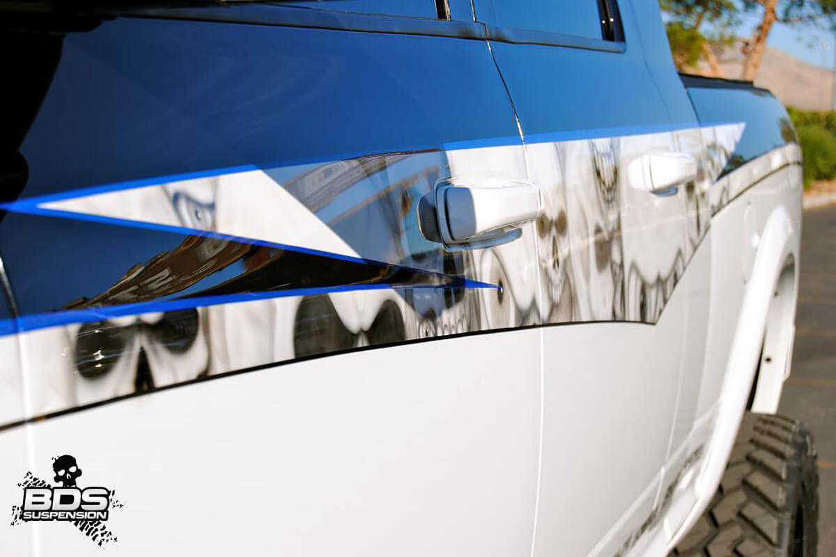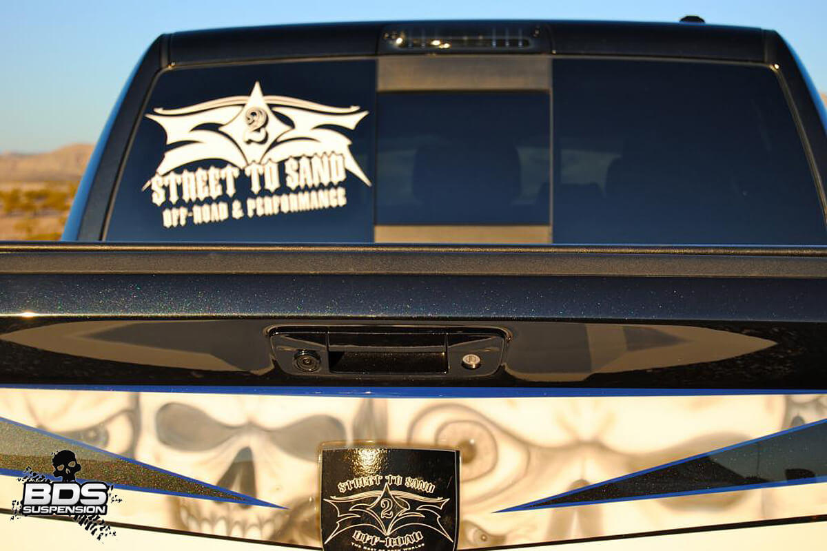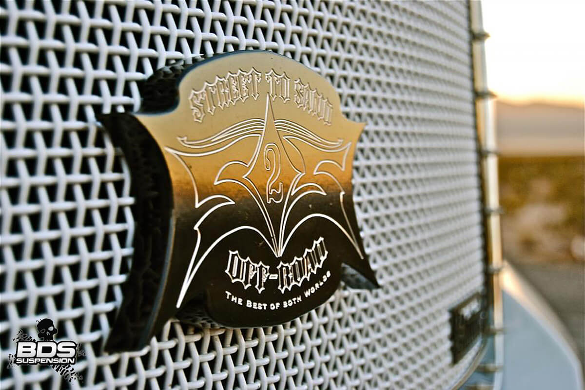 When it comes to Randy’s daily driver, he’s been on a Cummins kick lately. His 2012 Ram 3500 is a 6.7L workhorse sporting both off-the-shelf parts and one-off components built in-house with the S2S’s fabrication and CNC machining equipment. Gracing the pages of an upcoming Truckin’ Magazine issue, this truck grabs attention everywhere it goes with no part left untouched. Up front a Fusion bumper was installed for a clean flush appearance that houses a variety of Rigid LED lights. The stock headlights were swapped to a colormatched projection unit and house even more Rigid LEDs. In place of the traditional Ram grill is a BMF unit and functional SRT10 ram air hood to hint at the performance mods beneath. Playing off the truck’s body lines, the factory white paint color was transformed to a custom 2-tone scheme along with a skull themed airbrush and blue pin striping. To dial in the stance, Randy chose the BDS 8” long arm kit that he modified to 10” and ran with BDS dual shock hoops, Fox 2.0s and a dual steering stabilizer all colormatched to fit the theme. Sending power to the axles are a pair of lengthened one-piece driveshafts. Gears were swapped out for a set of 4.56s and billet S2S diff covers were installed front and rear. For wheels and tires, 38×13.50×24 Nitto Trail Grapplers fit the build and were mounted up on 24×10.5 BMF M80 wheels, once again getting extra attention with painted inserts. Up top a 50” Rigid lightbar provides even more long range visibility roof mounted using Street 2 Sand’s low profile brackets. Out back the truck sports BDS leaf springs, blocks, and Fox shocks. The bed was Line-X’ed and features a CargoGlide CG2000XL sliding rack and an Extang tonneau cover. The rear bumper came from Fusion as well and features Rigid D2 lights along with custom badging built machined in house and a pair of Recon LED taillights.