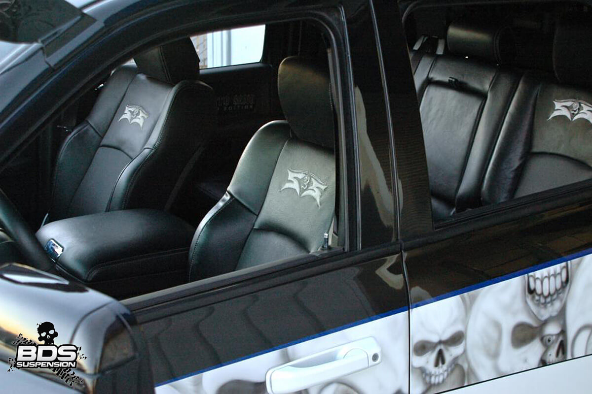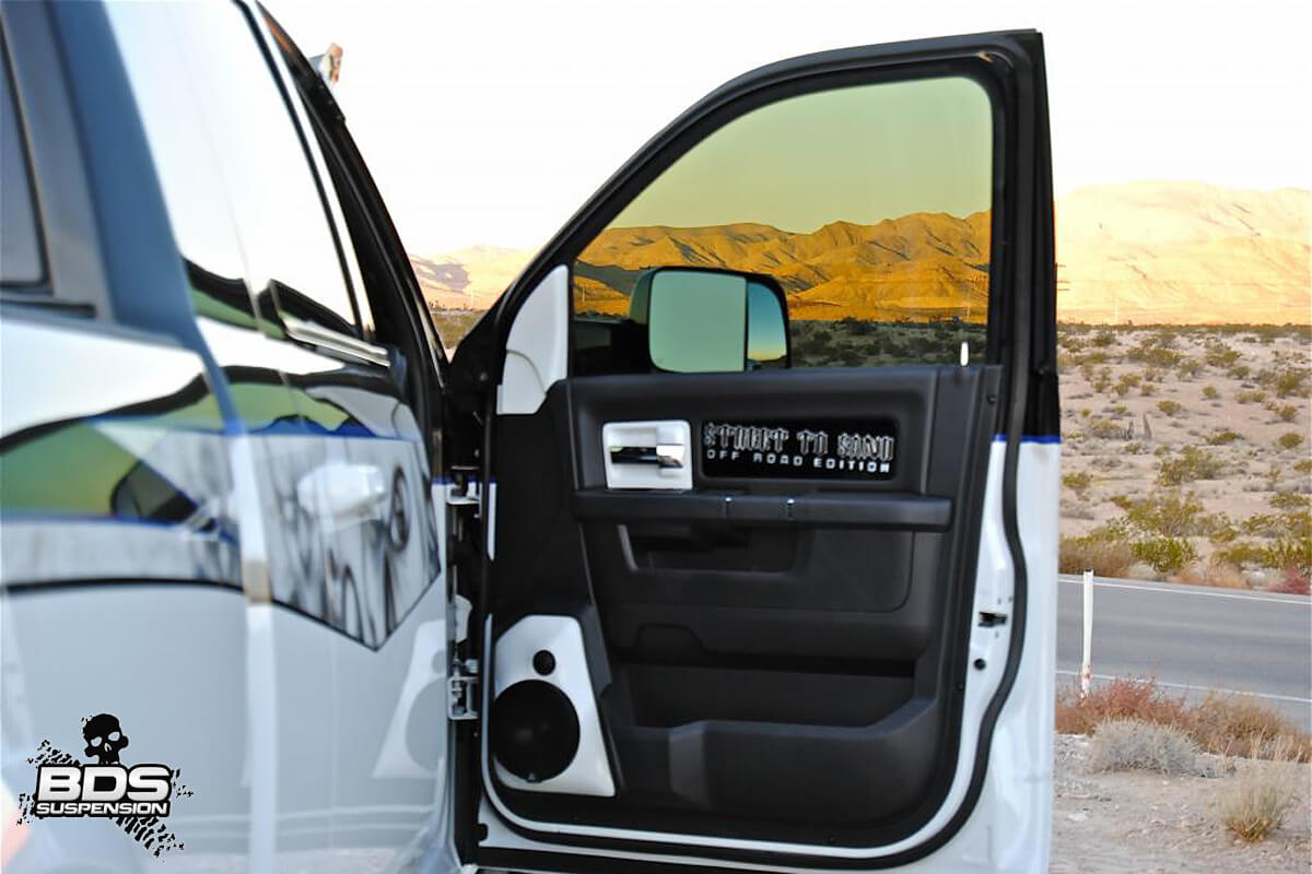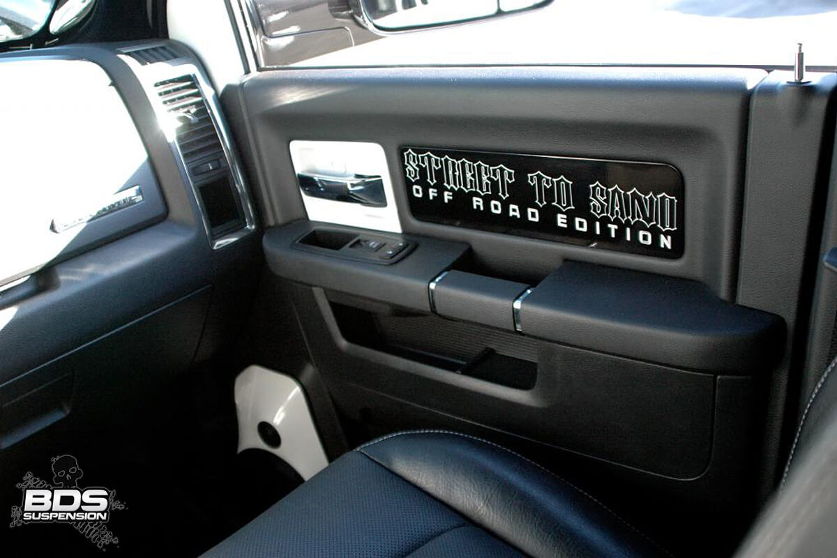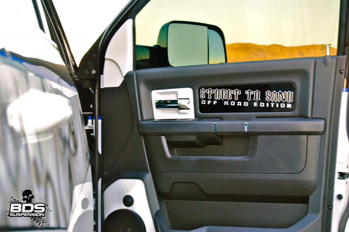 The interior of this truck features equal attention to the exterior with S2S embroidered black leather seats, suede headliner, colormatched interior panels and S2S custom control panel to mount the assortment of switches. Sound comes from a complete JL Audio system to get the party going wherever and whenever Randy shows up. Under the hood the stock 6.7L Cummins has no trouble rolling the 38s and features an H&S Mini Maxx tuner, S&B intake, 50HP injectors, ARP head studs, Air Dog 200 fuel system, billet valve cover and Diamond Eye exhaust system. In place of the stock tranny an ATS Stage4 68RFE was installed and is mated to the stock t-case with the help of BDS’s indexing ring kit. For long trips a 60-gallon fuel tank was installed to improve the trucks range for all the events that Randy attends. For more on this rig check out Street 2 Sand Performance or head to BDS’s Facebook Page.