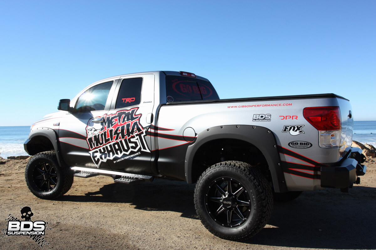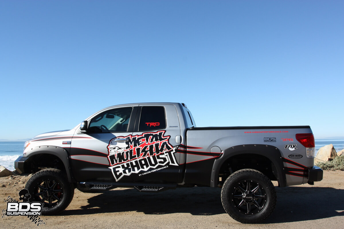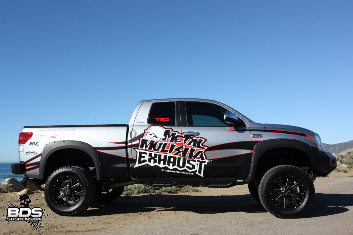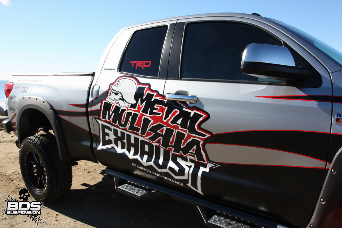 One of the trucks grabbing attention outside was Todd Headlee’s 2013 Toyota Tundra TRD. Representing Gibson’s Metal Mulisha exhaust line this TRD sports a variety of mods to help it perform out in the open desert terrain around Southern California. Built by Go Big Truck Performance, the stock suspension was replaced with a BDS 7” Performance Series suspension featuring Fox Racing 2.5 remote coilovers up front and rear Fox 2.0 shocks. The rear features a Firestone Ride-Rite airbag system with wireless controls to keep the stance level when hauling gear and towing trailers. Under the hood the stock 5.7L gets some help from a TRD supercharger, TRD intake and Gibson metal mulisha exhaust kit. Bringing this rig to a stop are TRD big brakes at each corner. This Tundra sees its share of dirt and pavement, so Todd went with a good all around tire. 35×12.50×20 General Grabbers AT2s fit the build and were installed on a set of 20×10 DPR Offroad Tech-9 wheels.