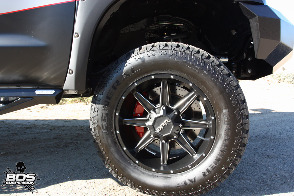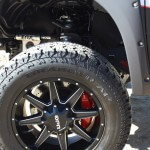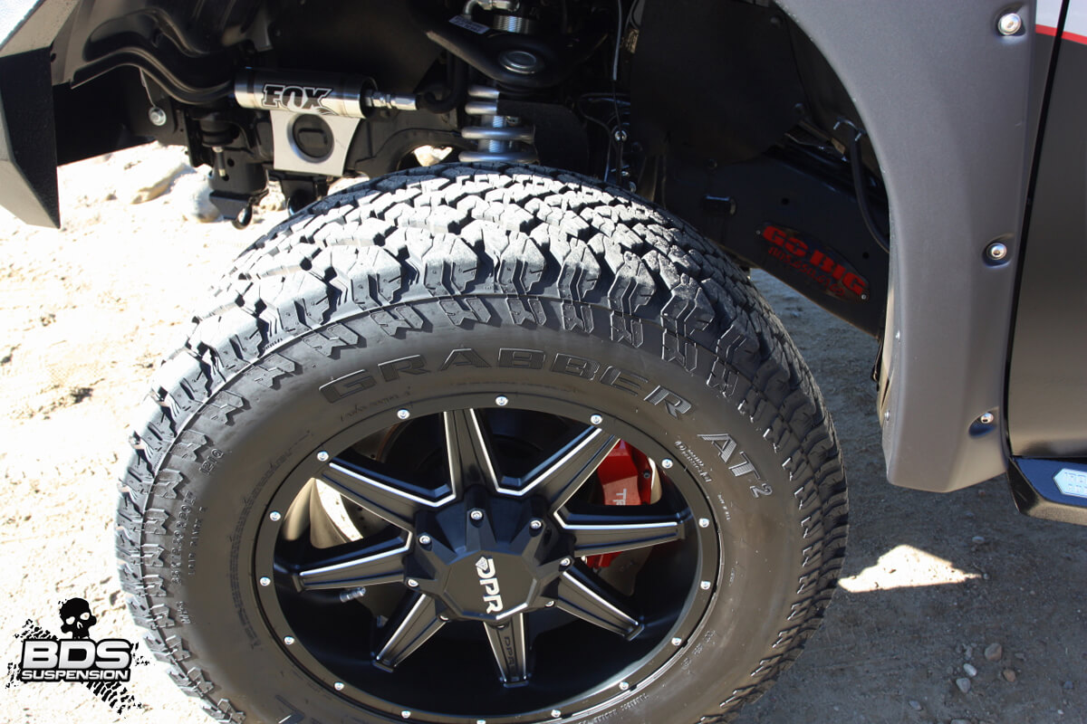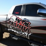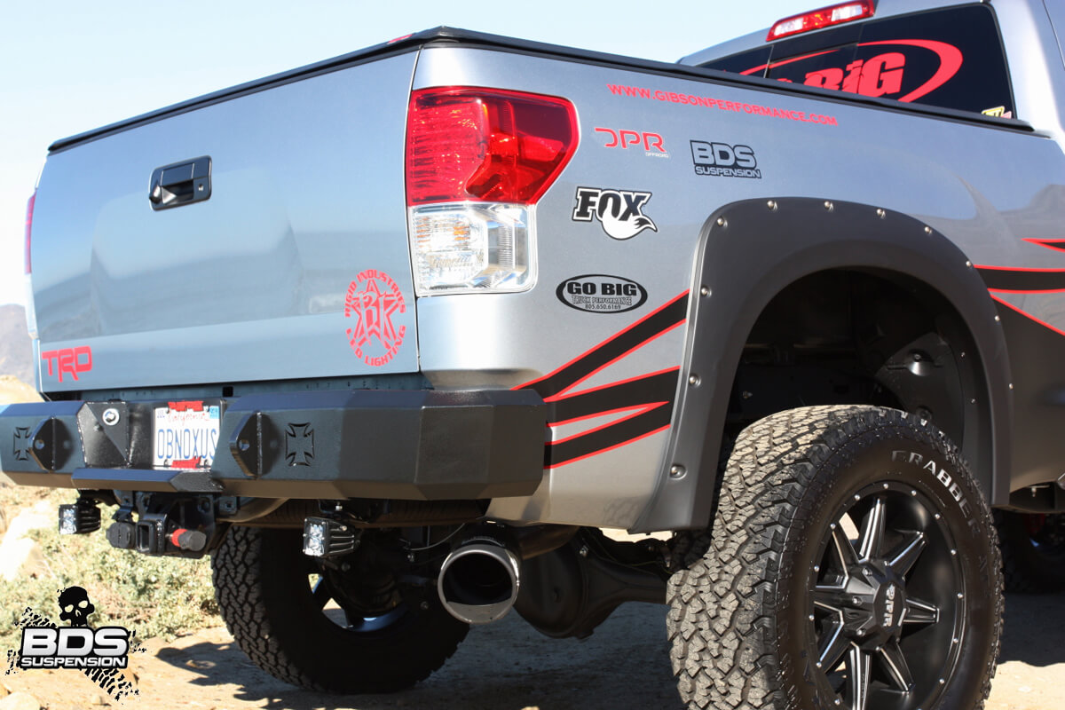 One of the trucks grabbing attention outside was Todd Headlee’s 2013 Toyota Tundra TRD. Representing Gibson’s Metal Mulisha exhaust line this TRD sports a variety of mods to help it perform out in the open desert terrain around Southern California. Built by Go Big Truck Performance, the stock suspension was replaced with a BDS 7” Performance Series suspension featuring Fox Racing 2.5 remote coilovers up front and rear Fox 2.0 shocks. The rear features a Firestone Ride-Rite airbag system with wireless controls to keep the stance level when hauling gear and towing trailers. Under the hood the stock 5.7L gets some help from a TRD supercharger, TRD intake and Gibson metal mulisha exhaust kit. Bringing this rig to a stop are TRD big brakes at each corner. This Tundra sees its share of dirt and pavement, so Todd went with a good all around tire. 35×12.50×20 General Grabbers AT2s fit the build and were installed on a set of 20×10 DPR Offroad Tech-9 wheels.