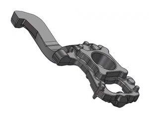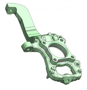 A replacement knuckle is difficult and expensive to design. This is the most challenging part we make and will dictate every other feature of the lift kit. All of the steering and suspension angles need to match in order to keep the factory ride and stability control features. The casting needs to fit within a certain sized mold, has to have good material flow characteristics, and have enough material to machine off, but not too much material that creates a lot of waste. After a week of crunching the numbers and a couple calls to the foundry and machine shop we end up with the cast and machined models.